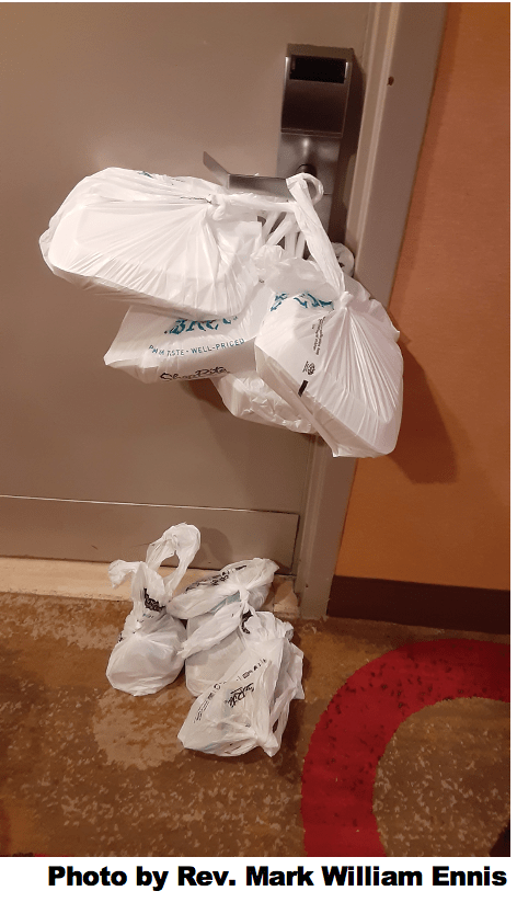 I was part of a team that delivered these meals. We went room to room in two different hotels placing food bags on doorknobs, knocking on doors and yelling, “dinner.” A number of residents came out and graciously thanked us. At one room, we left four dinners. It was explained to me that a whole family was living in that room. My heart sank with that news. It is one thing to be single and homeless and another to be homeless with a family. I have been fortunate enough never to have had such an experience.
