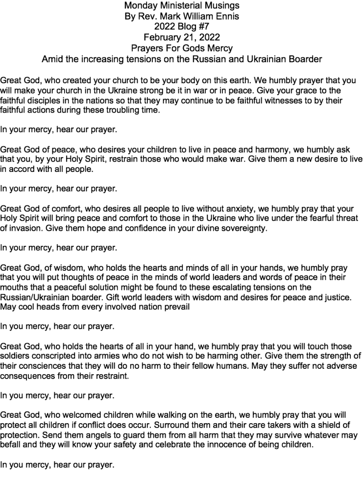 Prayers For Gods Mercy Posted bypastormarkauthor February 21, 2022 Leave a comment on Prayers For Gods Mercy Amid the increasing tensions on the Russian and Ukrainian Boarder Share this: Click to share on X (Opens in new window) X Click to share on Facebook (Opens in new window) Facebook Like Loading... Related Published by pastormarkauthor I have been a Reformed Church in America pastor and Christian Author since 1984. In addition I am certified Crisis Counselor, certified Disaster Chaplain and have two units of Clinical Pastoral Education. View more posts