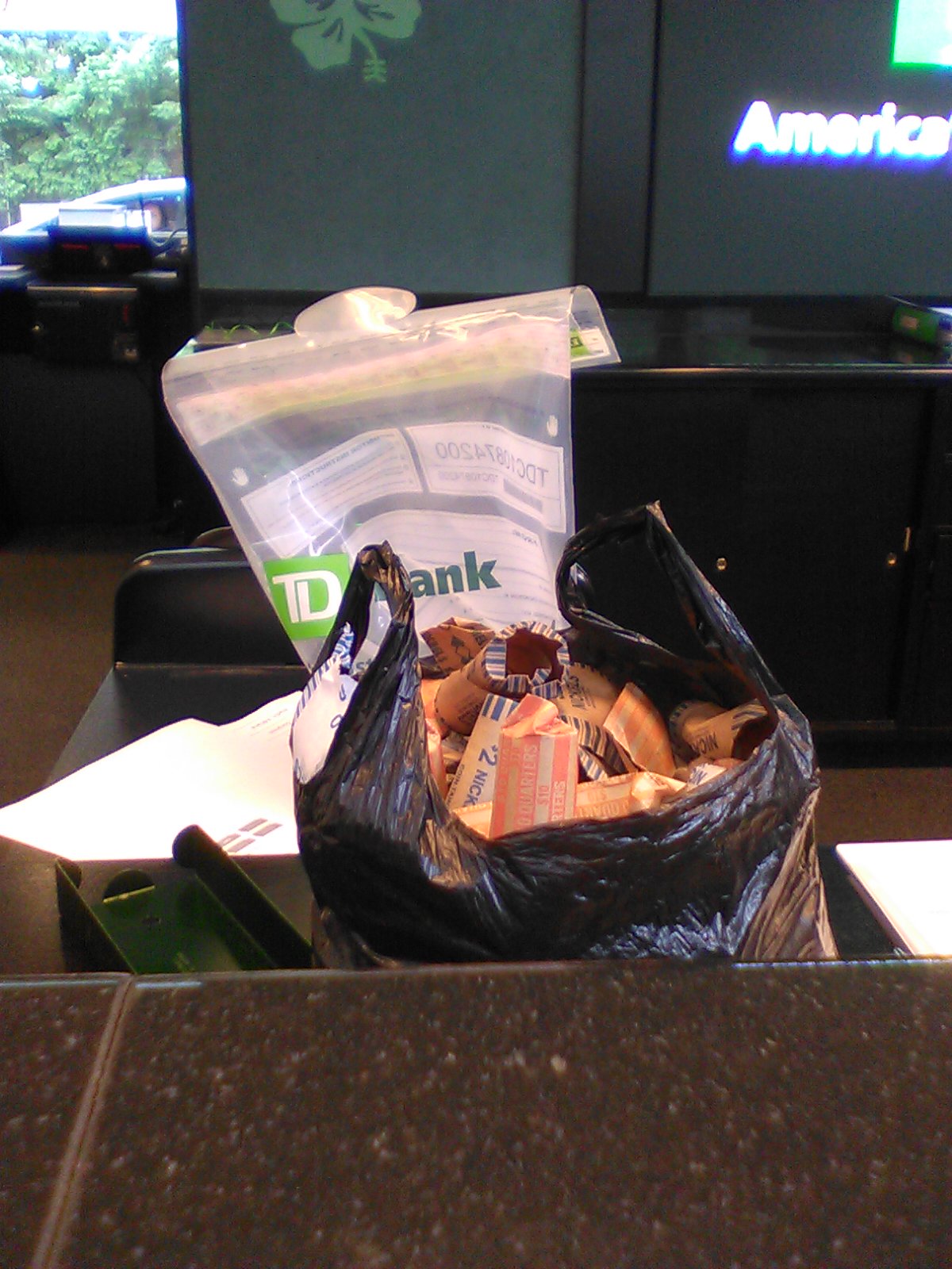 Now I am back to coin rolling. As my jar fills up, I roll the coins, write my account number on each roll and take them to the bank. Recently I was surprised to learn that at my local TD Bank, these rolls are opened and the coins are dumped into a common bag. The bagged, un-rolled coins are then sent out to be counted by a machine in another location.